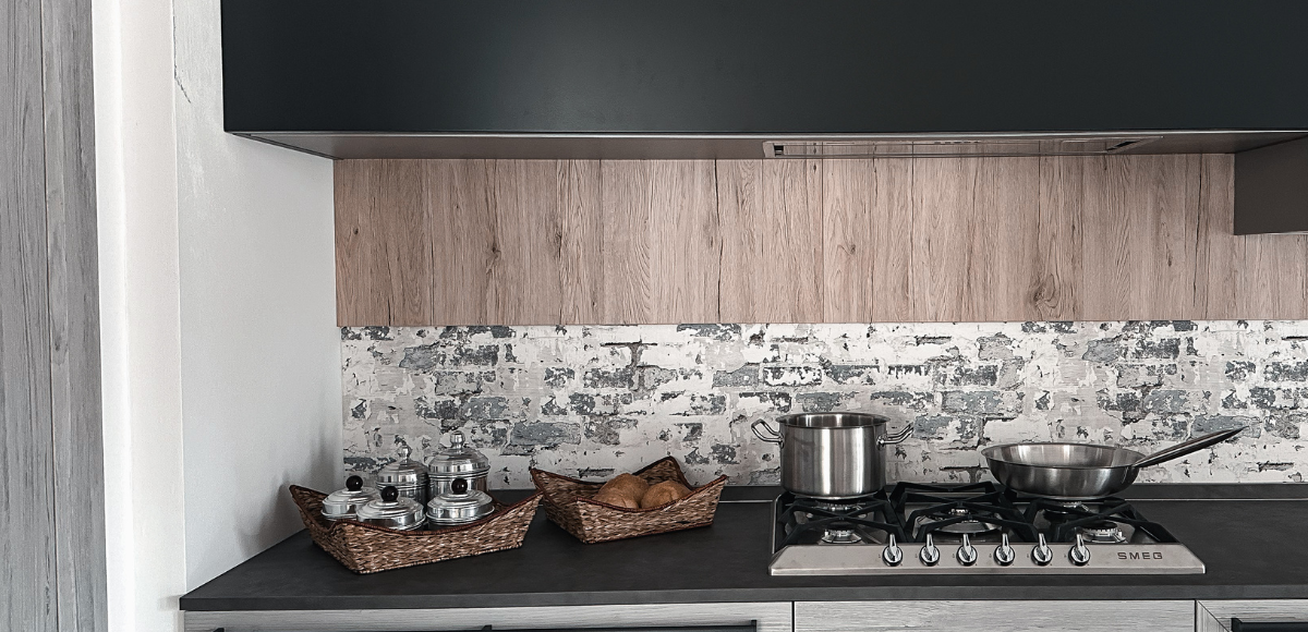 Tale soluzione cucina prevede un lavello vasca grande a incasso Granitek elleci da 60 cm e una cappa a libera installazione da 180 cm.